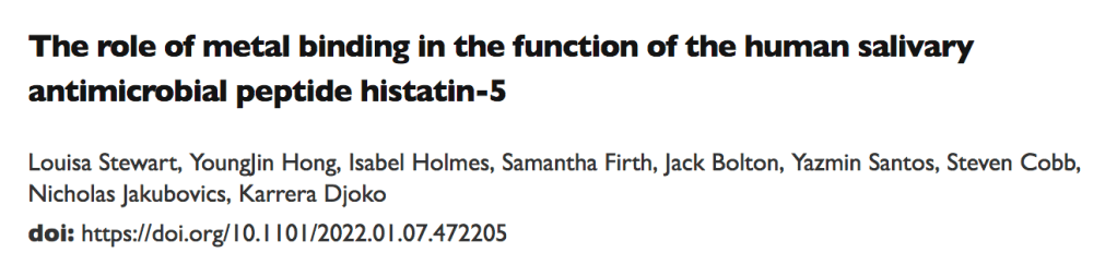 The group’s latest preprint on salivary histatins is now live on bioRxiv. Congratulations to all authors, especially co-first authors Louisa and Jin! Share this: Click to share on X (Opens in new window) X Click to share on Facebook (Opens in new window) Facebook Click to email a link to a friend (Opens in new window) Email Click to share on LinkedIn (Opens in new window) LinkedIn Related Published by karreradjoko View all posts by karreradjoko