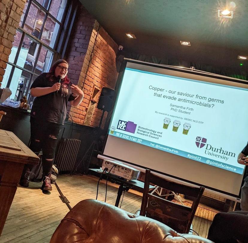 The group is very proud of Sam Firth (4th year PhD student), who participated in Pint of Science Newcastle yesterday and shared her knowledge about all things copper to the general public. Well done, Sam! Here’s a photo of Sam in action: