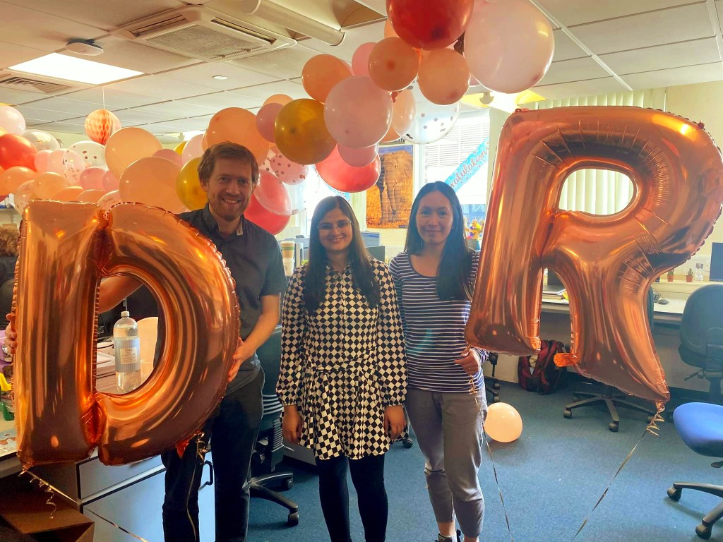 We are very proud to announce that Atreyee passed her viva voce examination with minor corrections. Atreyee’s thesis was entitled “Bioactivity of Substituted Copper Pyrithione Complexes”. Atreyee will now return to her beloved home country, India, to seek an industrial position there. We wish her all the very best! Below is a picture of the celebrations with both supervisors.